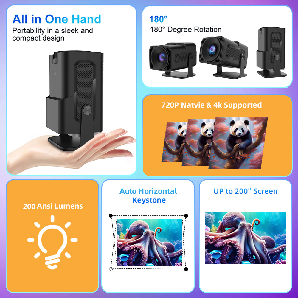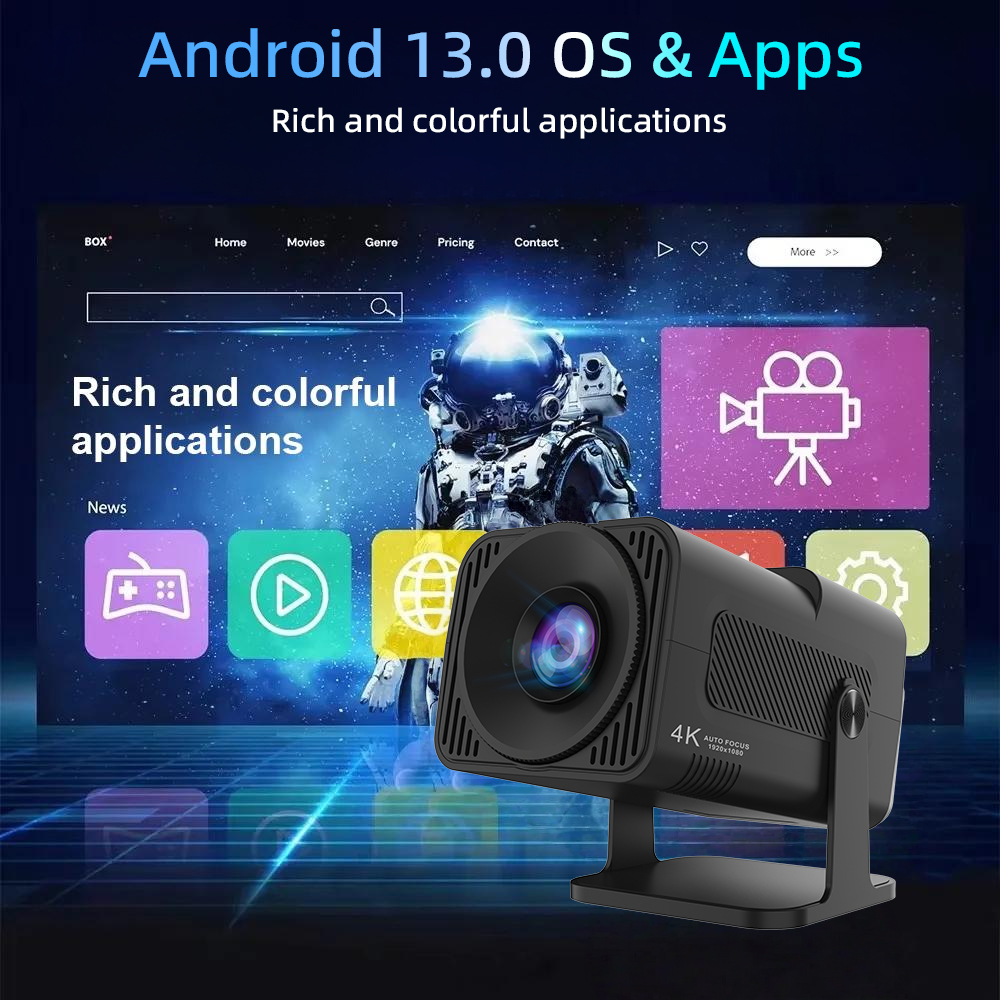 The KG12 Smart Projector offers 720P resolution and 200 ANSI lumens, delivering sharp and vibrant visuals. Supporting 4K maximum resolution and powered by Android 13, it ensures a versatile entertainment experience for home and outdoor use.