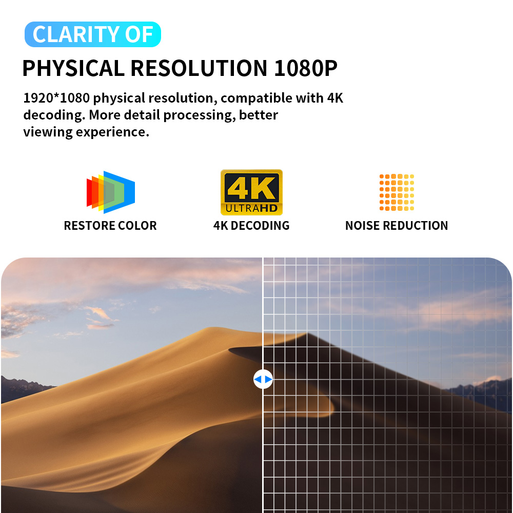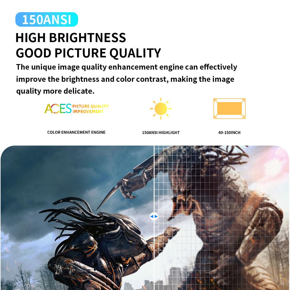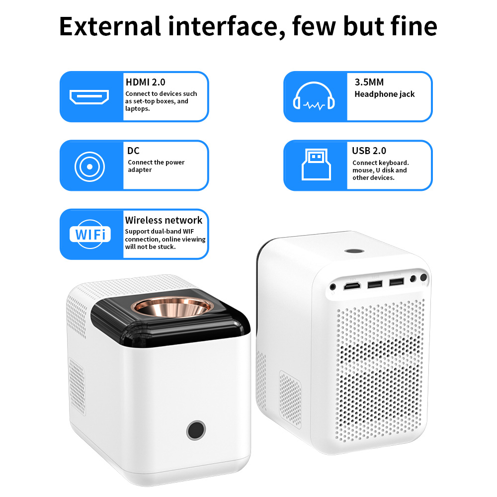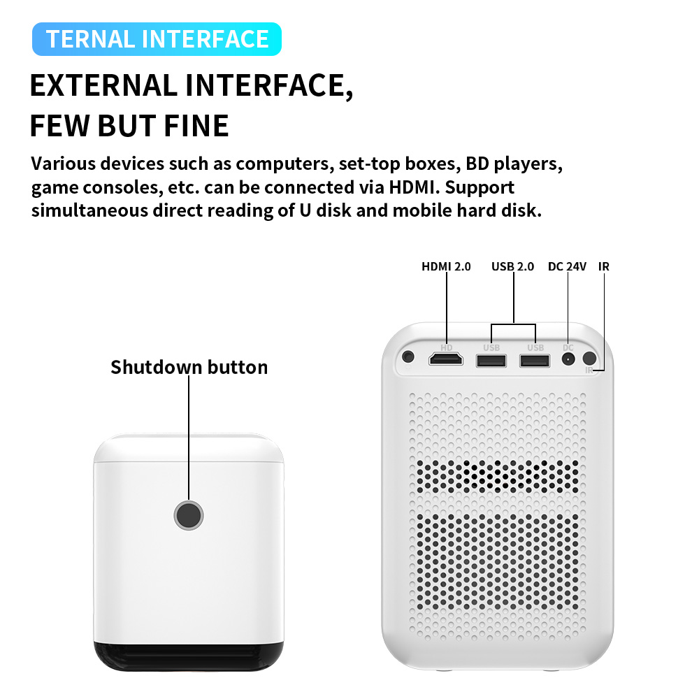 Short focus HDMI in/USB*2/AV 30000 1;25.0 Electronic correction 0.9/1.4/2 40/60/100 Android11.0 Allwinner H713 1GB+8GB Realtek 8822/8723 2.4G/5G BT5.0 Bluetooth remote control English, German, French, Russian….. 20V-3.15A 55W Power supply, remote control, main unit, instruction manual CCC/CE/UL/ROSE/ISDE temperature control Front and rear/2.4G White main body with black decoration 1.3 105*155*130 245*170*125 12 units 44.5*393*369 16.7KG 3W*2